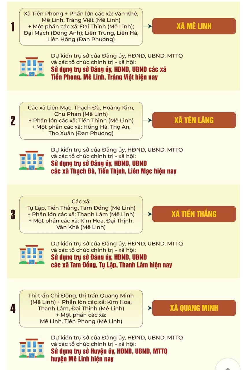 Sau khi sắp xếp lại đơn vị hành chính, huyện Mê Linh (Hà Nội) sẽ có 4 xã mới: Mê Linh, Quang Minh, Yên Lãng và Tiến Thắng.